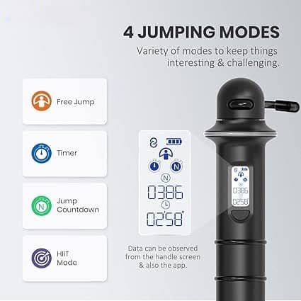 حالتهای تمرین: پرش آزاد، شمارش زمان، شمارش دفعات، تمرین HIIT، تمرین دورهای، پرش با هوش مصنوعی (حالتهای آخر نیازمند اپلیکیشن)